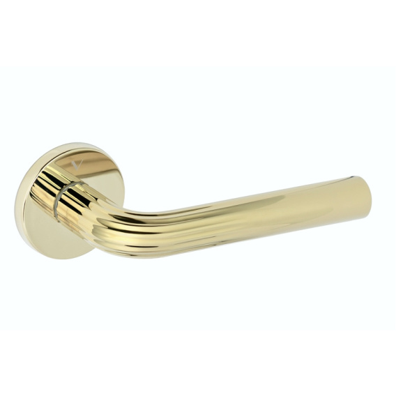 Dzięki technologii PVD (Physical Vapor Deposition), klamka jest wyjątkowo odporna na ścieranie, zarysowania i korozję, co zapewnia jej trwałość oraz intensywny, złoty kolor na długie lata. Model osadzony jest na okrągłej rozecie, która subtelnie podkreśla estetykę drzwi, nie dominując przestrzeni.